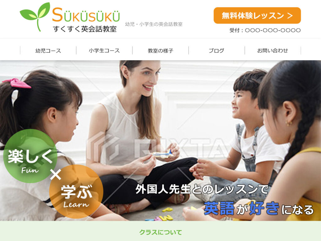 サイトカラーはオレンジと緑でポップな色使いにし、子供がワクワクした気持ちで英会話を楽しんでいる様子を演出しています。