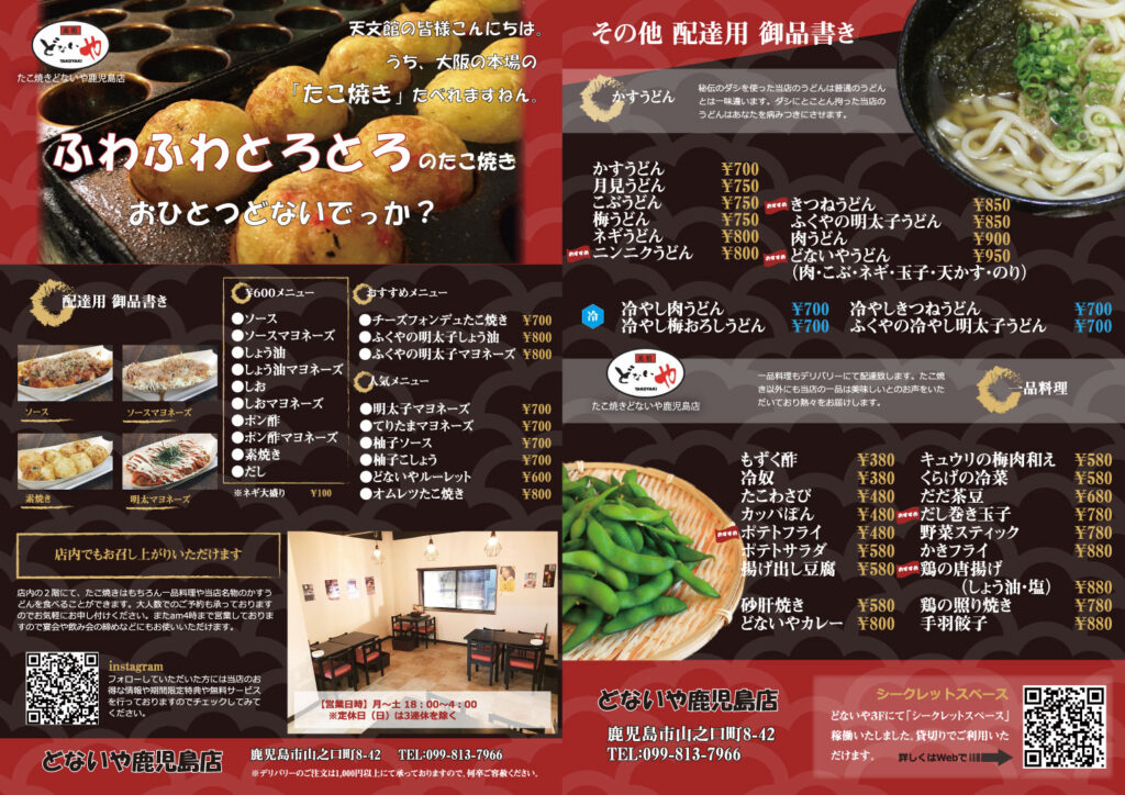 どないや鹿児島店様のチラシを制作しました。食べ物を大きく配置することで食欲を駆り立てるように仕上げております。