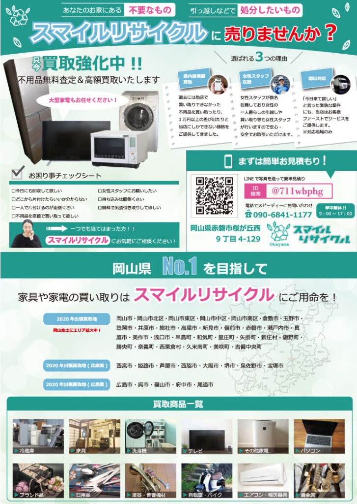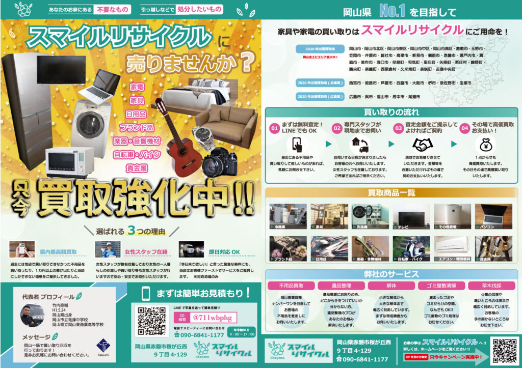 スマイルリサイクル様のチラシを制作しました。リサイクル事業の宣伝ということで、環境への優しさを表現した色合いで仕上げております。