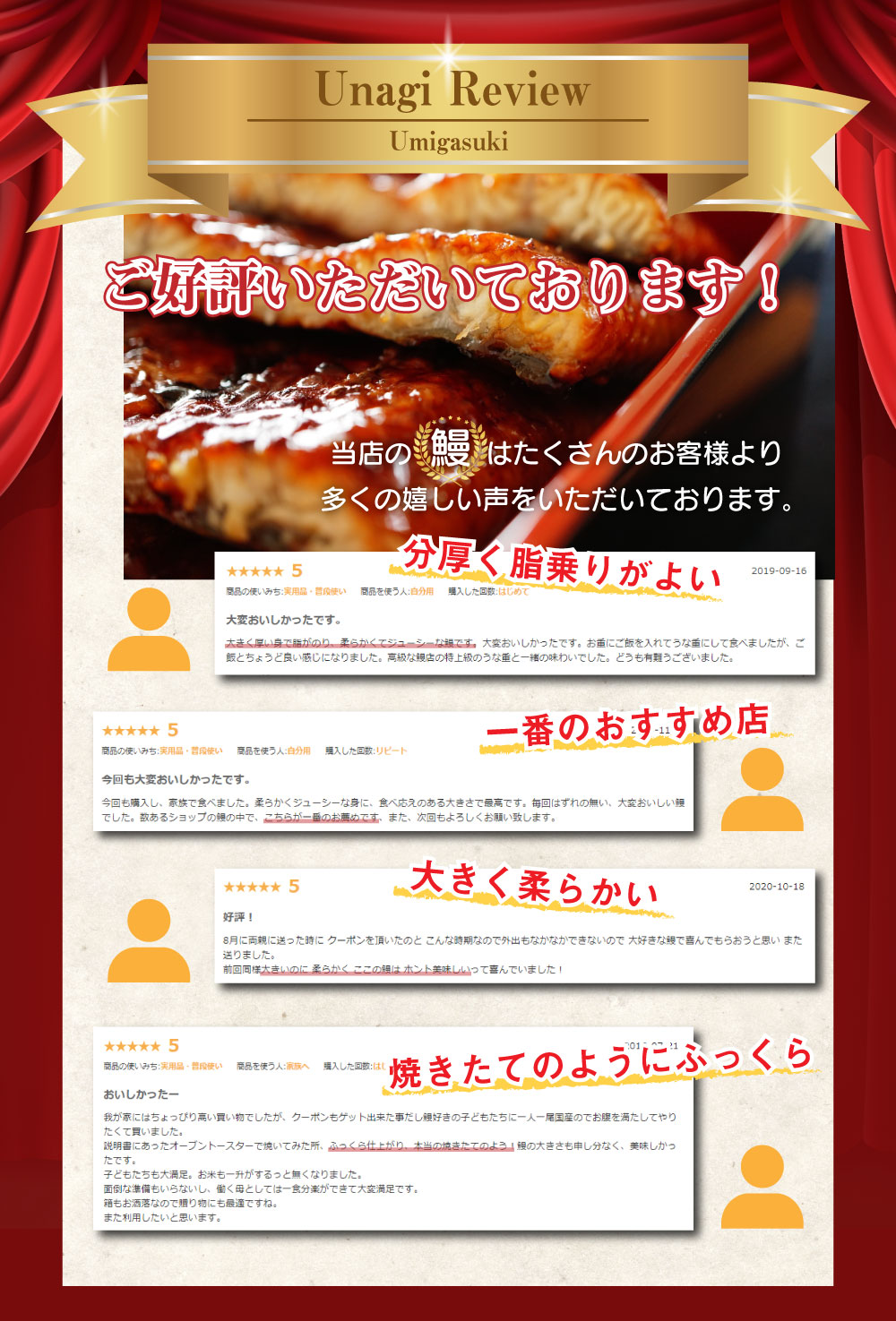 うなぎの楽天商品ページのレビュー画像を制作しました。口コミの中からうなぎの訴求ポイントが目立つようにデザインしております。